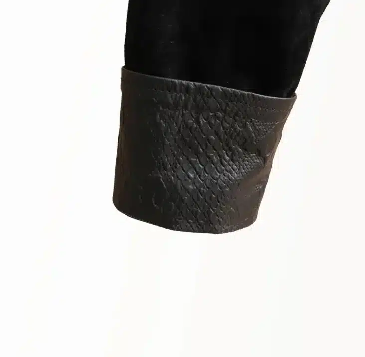 One of the standout elements of this jacket is the snake skin texture panels placed on the sides and sleeves. These textured details create a unique contrast with the smooth suede body, giving the jacket a strong and fashionable streetwear look. The contrast stitching further enhances the structure and highlights the premium craftsmanship of the jacket.
